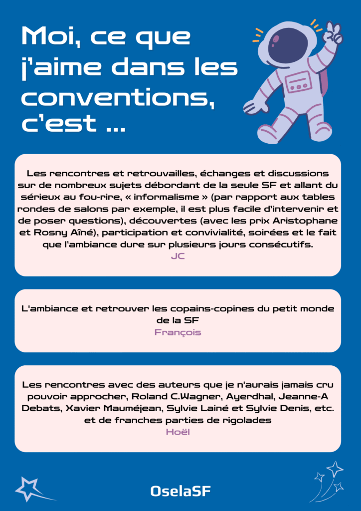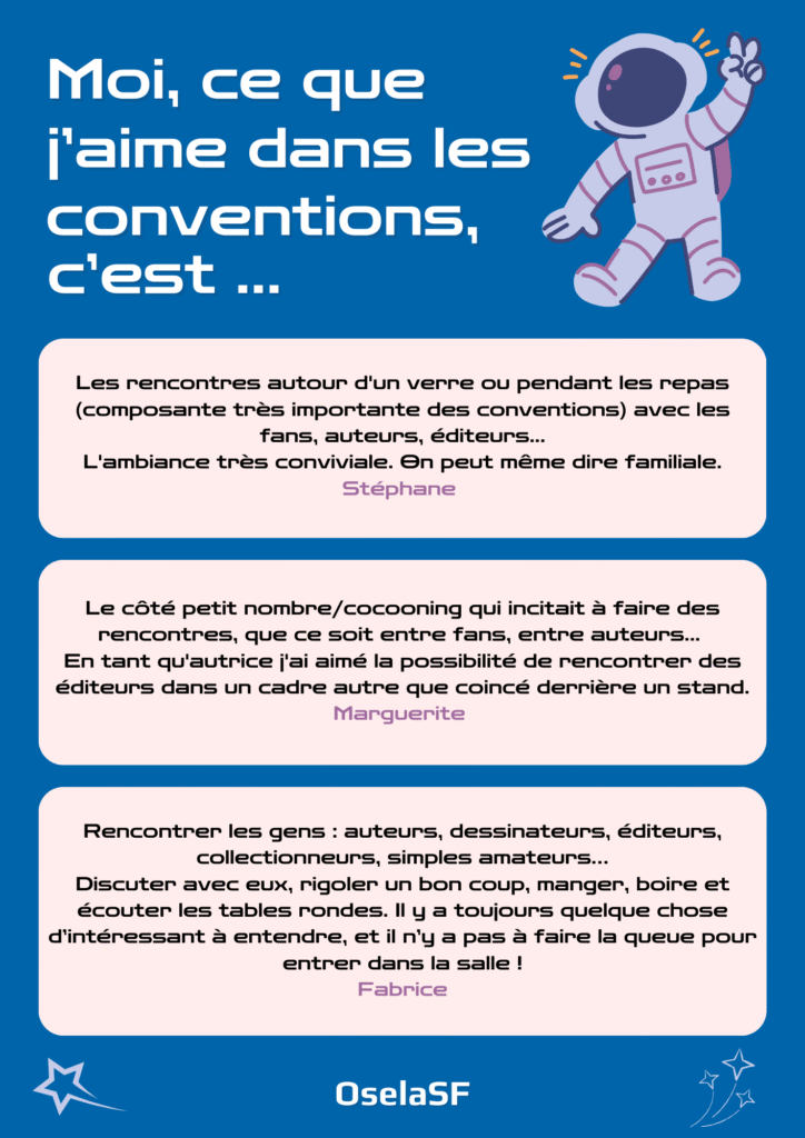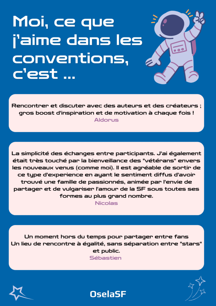 Après avoir tenté l’aventure, de nouveaux membres de convention en sont ressortis conquis. Pourquoi tant d’enthousiasme ? Ce qu’ils et elles aiment, ce qui les inspire, ce qui les rassemble : découvrez leurs témoignages et plongez dans l’ambiance unique de ces événements qui célèbrent la science-fiction sous toutes ses formes.